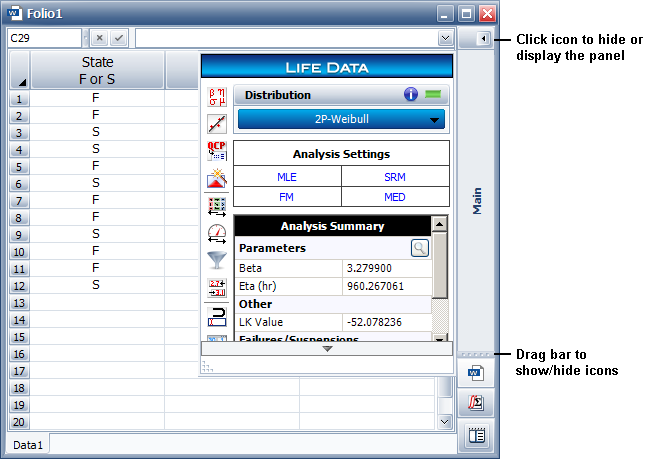 When the control panel is hidden, only the title bar and page icons will be visible on the right side of the window (as shown next using a Weibull++ folio as an example). When you click the bar, the active page will be displayed temporarily. When you click anywhere outside of the control panel page, it will be automatically hidden again.