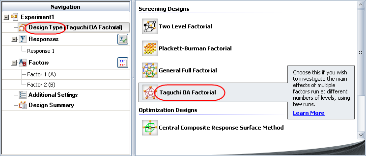 Click Design Type in the folio's navigation panel, and then select Taguchi OA Factorial in the input panel.