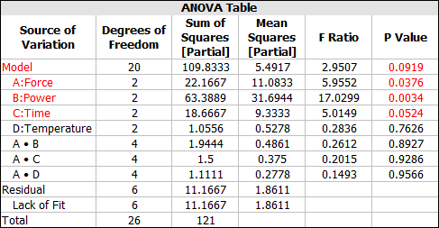 From this table, you can see that effects A, B, C are significant. To simply the analysis, the next step is to recreate the model using only the significant terms.