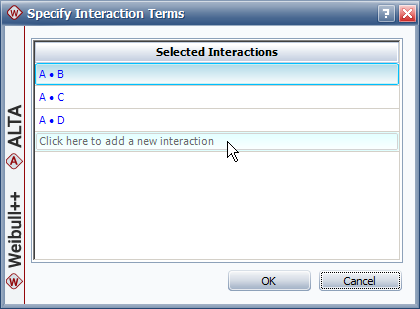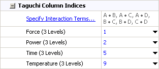 To have the software determine which columns in the array will be assigned to the factors, click the Specify Interaction Terms link. In the window that appears, enter all possible two-way interactions between the factors being investigated. The easiest way to do this is by repeatedly clicking the row that says "Click here to add a new interaction" until the row disappears.