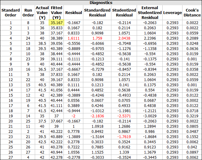 Click the View Analysis Summary icon on the control panel. In the Analysis Summary window that appears, view the Diagnostic Information table. The table is shown next. In order to identify which factor settings can provide the smallest ball size (and hence the best process), look for the runs in the table with the Fitted Value (YF) closest to zero (highlighted).