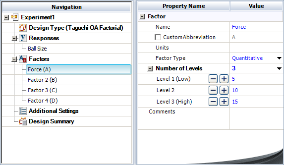 Define each factor by clicking it in the navigation panel and editing its properties in the input panel. The properties are given in the table above. The first factor is defined as shown next. (Note that every factor must be configured to have three levels.)