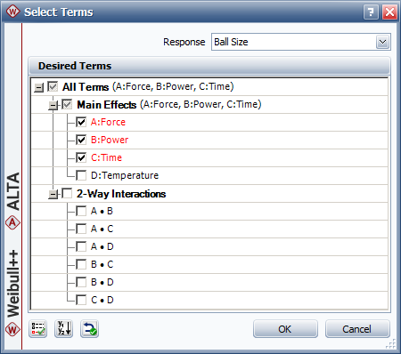 In the Select Terms window that appears, click the Select Significant Effects button to select only the significant effects to calculate the new model, as shown next, then click OK.