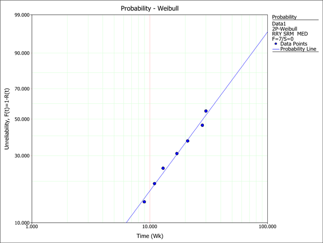 Next, click the Plot icon on the control panel. The following probability plot shows the probability line with respect to the values obtained from the non-parametric analysis. As you can see, the 2P-Weibull provides a good fit to the values.