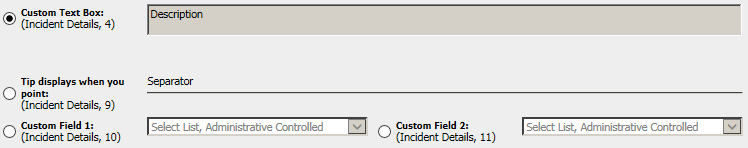 The options depend on the type of field (description, date, check box, etc.) and the type of record (incident, problem, etc.). Some of the current settings are displayed in parentheses under the field name. In the following example, the "Custom Text Field" will display in the first detail field position in the "Incident Details" area of the Incident page, and it will be read-only after a value is entered. The "Custom Date Field" will display in the second portion of that area, and is required (red text).