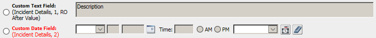 The options depend on the type of field (description, date, check box, etc.) and record (incident, problem, etc.). Some current settings appear in parentheses under the field name. In the following example, the "Custom Text Field" will display in the first detail field position in the "Incident Details" area of the Incident page, and it will be read-only after a value is entered. The "Custom Date Field" will display in the second portion of that area, and is required (red text).