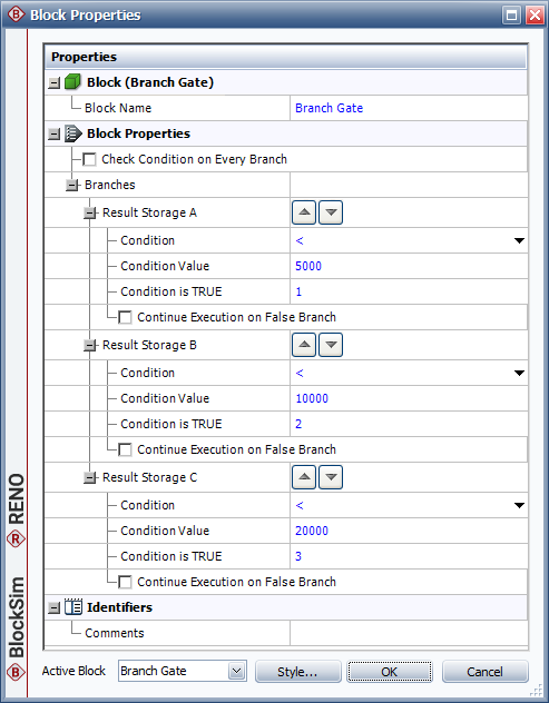 The following picture shows the Block Properties window of the branch gate in the example. The branch gate checks the incoming value against each branch sequentially, based on the order shown in the Block Properties window (you can move a block up or down in priority by clicking the arrows that appear next to the block's name). The branch gate then passes only the output of the first branch that evaluates to true.