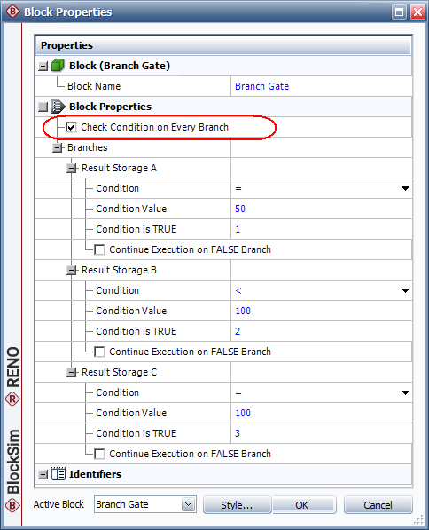 By default, the branch gate passes only the output of the first branch that evaluates to true. You can configure the branch gate to pass the output of every branch that evaluates to true by selecting the Check Condition on Every Branch check box. With this setting, the order of the branches does not affect the output of the branch gate.