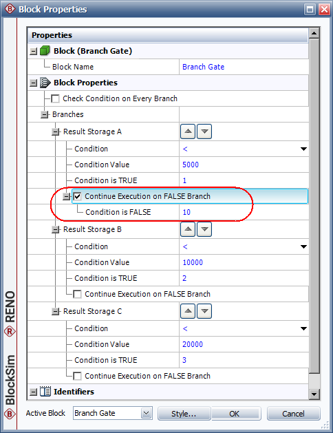 If you wish to have the branch gate pass an output when a branch evaluates to false, select the Continue Execution on FALSE Branch check box and enter a value in the Condition is FALSE field that appears, as shown next. In this example, if the incoming value is 6,000, then the branch gate will pass two outputs: the value 10 to the "Result Storage A" branch, and the value 2 to the "Result Storage B" branch.