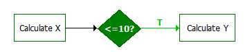 In the example shown next, if the incoming value is greater than or equal to zero, the value 1 will be passed down the "true" path and the value 10 will be passed down the "false" path. Similarly, if the condition evaluates to false, the value 0 is will be passed down the "false" path and the value 5 will be passed down the "true" path. (See also Flowchart Configurations and Execution for a discussion on how flowcharts are executed.)