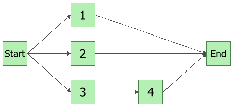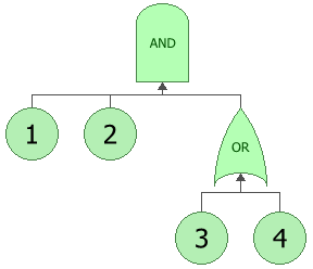 The system will fail if {1, 2, 3 and 4 fail} or {1, 2 and 3 fail} or {1, 2 and 4 fail}. All of these are cut sets. However, the one including all components is not a minimal cut set because, if 3 or 4 is removed, the remaining events are also a cut set. Therefore, the minimal cut sets for this configuration are {1, 2, 3} or {1, 2, 4}. This may be more evident by examining the RBD equivalent of the fault tree, as shown next.