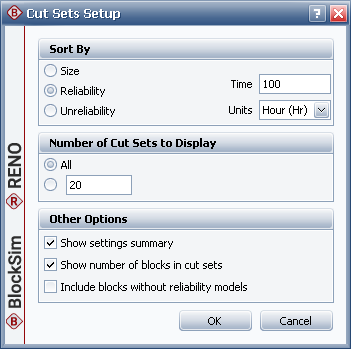 Reliability or Unreliability: Cut sets will be shown in ascending order of reliability or unreliability. Reliability is the probability that at least one block in the cut set survives. Unreliability is the probability that all blocks in the cut set fail. If you select either of these options, you must specify a time at which the reliability or unreliability is calculated and the units used for the time.