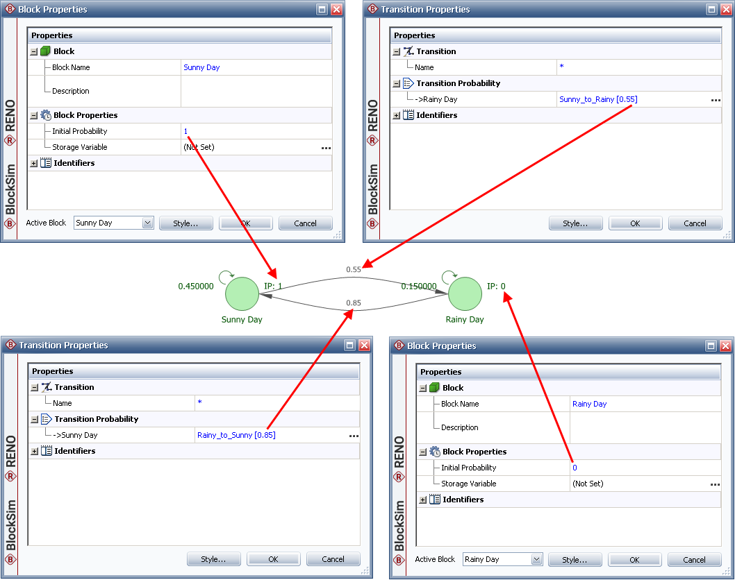 To configure a state block in a discrete Markov diagram, you will need to specify the probability that the system will be in that state during the first step of the analysis in the Initial Probability field. The sum of the initial probability values for all of the state blocks in the diagram must be equal to 1.
