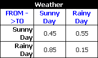 Note that when it is a sunny day, the probability of it remaining in that state the next day is 0.45 (1.00 - the 0.55 probability of a rainy day), as shown at the upper left corner of the "Sunny Day" block. Similarly, when it is a rainy day, the probability of the next day being rainy is 0.15 (1.00 - 0.85), as shown for the "Rainy Day" block.