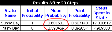 On the Result Summary page, you can see that the mean probability of the system being in the "Sunny Day" state is approximately 0.602, and the mean probability of the system being in the "Rainy Day" state is approximately 0.398, as shown next.