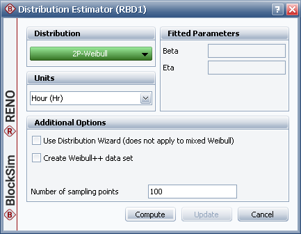 To calculate the parameters for a different distribution, choose the distribution in the Distribution area and specify the time units in the Units area, then click Compute. BlockSim will use the Weibull++ life data analysis engine to calculate the distribution parameters based on the diagram.