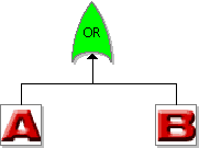 Fault tree diagrams consist of gates and events connected with lines. The AND and OR gates are the two most commonly used gates in a fault tree. To illustrate the use of these gates, consider two events (called input events) that can lead to another event (called the output event). If the occurrence of either input event causes the output event to occur, then these input events are connected using an OR gate. Alternatively, if both input events must occur in order for the output event to occur, then they are connected by an AND gate. The next figure shows a simple fault tree diagram in which either A or B must occur in order for the output event to occur.