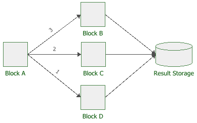 Consider a block (Block A) that has three outgoing paths. The order of execution of the outgoing paths is based on the connector priority, as shown in the following example. In this case, the path represented by connector 1 will be simulated first, followed by the path for connector 2 and then for connector 3. The simulation continues down each path until it reaches an end, and only then is the next path in the queue executed. A path reaches an end when it is stopped by a block that requires a certain number of executed incoming paths (see Example 2) or it reaches the last block in the path.