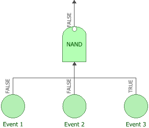 A NAND gate has a true output only if all input events are false; it has a false output event when any input event is true. In other words, if any of the input events occurs, then the output event will not occur. This is logically equivalent to using an AND gate followed by a NOT gate.