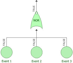 A NOR gate has a true output event when all input events are false. In other words, if none of the input events occur, then the output event will occur. This is logically equivalent to using an OR gate followed by a NOT gate.
