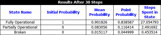Compare this to the following result summary, which shows the values for an analysis of 30 usage cycles where all three shifts have repair personnel available.