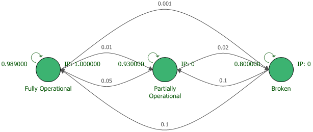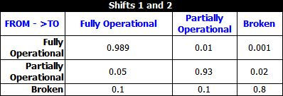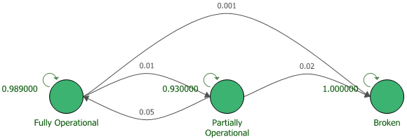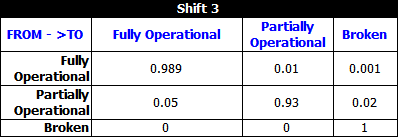 Let’s assume that the compressor runs in an environment where there are three shifts, and completes 10 usage cycles during each shift. During the third shift, nobody is available to perform repairs. This means that during those hours, the transition matrix and Markov diagram look instead like this: