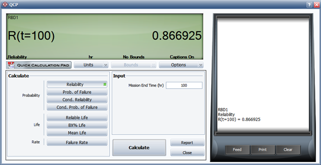 Select Captions if you want additional information to be displayed in the results area along with the values (a green light in the button indicates that this option is selected). For example, if you have selected to calculate the reliability for a given period of time, the first picture shows the display with captions and the second picture shows without.