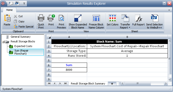 If a subchart block calls a flowchart that has a result storage block, then the output value of that result storage block is also reported in the Results Explorer. For example, the flowchart shown above has a result storage block called "Expected Costs." In addition, the "Repair Flowchart" also has a result storage block called "Sum." The values stored in both results storage blocks are reported in the Results Explorer, as shown in the navigation panel in the next picture.