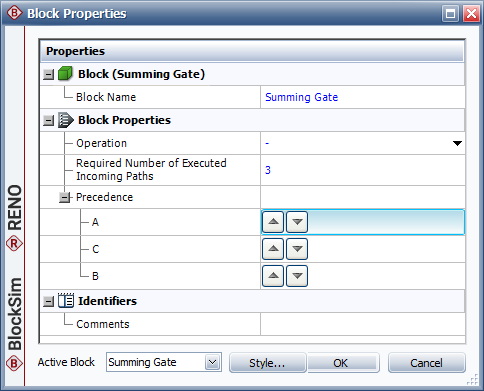 The Required Number of Executed Incoming Paths field allows you to control the number of inputs that the summing gate processes at any given time. Note that this value simply refers to how many inputs are required, and does not distinguish based on which path(s) the inputs come from. For example, if there are three incoming paths and three required inputs, one input from each path would trigger the block, but so would three inputs from the first path. An asterisk (*) in this field means that the required number of inputs is equal to the number of paths into the block. See Flowchart Configurations and Execution for an example on how this block setting affects the results of a flowchart.