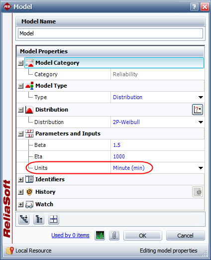 Resources that require you to define a unit (e.g., reliability models, duration models, etc.) will have their values automatically converted to the base unit during simulation. For example, let's assume that in your database, an hour is equal to 1 SBU. Now suppose your model is a Weibull distribution that is defined in terms of minutes, as shown next.