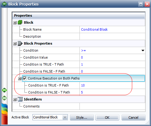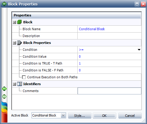 The following picture shows the Block Properties window of the conditional block in the example. In this case, if the output of Block 1 is greater than or equal to 0, then the value "1" is passed down the "true" path. However, if the output of Block 1 is less than 0, then the value 0 is passed down the "false" path.