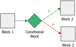 A conditional block functions as an "if" statement. It checks the incoming value against a conditional expression, with possible outcomes of true and false. A conditional block accepts one incoming path and may have one or two outgoing paths.