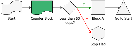 A counter block increments its value by a specified amount each time the simulation passes through it, and then passes the recorded value to the next block in the flowchart. It may have multiple incoming and outgoing paths. The following example shows a counter block that records the number of loops that it goes through. The counter block passes its tally to the conditional block that stops the loop when the condition is met.
