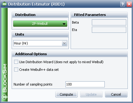 To calculate the parameters for a different distribution, choose the distribution in the Distribution area and specify the time units in the Units area, then click Compute. BlockSim will use the Weibull++ life data analysis engine to calculate the distribution parameters based on the diagram.