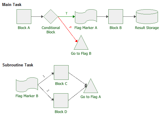 Subroutine Path 2: Block D → Go-to-Flag A → Flag Marker A → Block B → Result Storage.