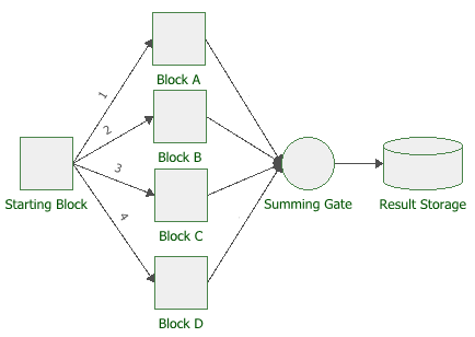 If the summing gate were configured to require only 1 executed incoming path, then the value of blocks A, B, C and D would be passed to the result storage block, without the summing gate performing any mathematical operation on the values.