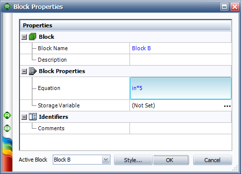 The following picture shows the Block Properties window of Block A. The Equation field contains the expression that the block evaluates. In this case, the expression is A+B+C.