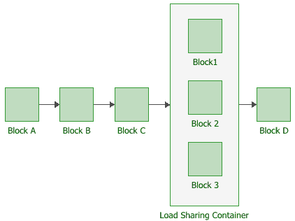 To configure a load sharing container, in addition to the common block properties, you will need to specify the Number of Paths Required, which is the number of active blocks/paths within the container that must succeed in order for the container to succeed. If the required number of blocks/paths does not succeed, then the container is considered to be failed. The contained blocks must be within the load sharing container, but they do not need to be connected to each other.