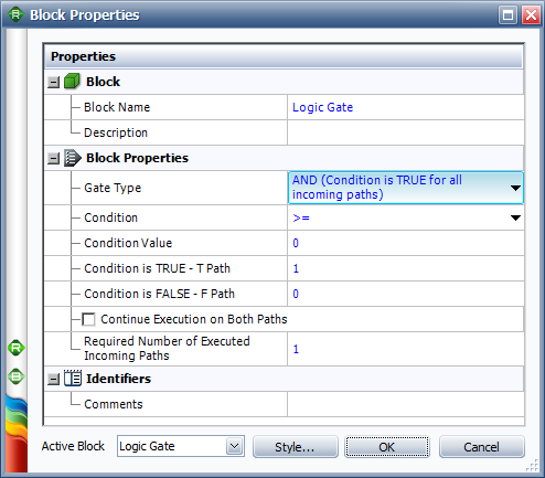 The following picture shows the Block Properties window of the logic gate in the example. In this case, the logic gate is an AND gate, meaning that all incoming paths must meet the condition in order for the block outcome to be true. If the outputs of Blocks 1, 2 and 3 are all greater than or equal to 0, then the block outcome is true and the value "1" is passed down the "true" path. However, if one of the outputs is less than 0, then the block outcome is false and the value 0 is passed down the "false" path.