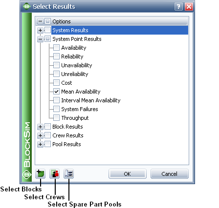 If you have selected to save a block result, crew result or pool result, you must specify at least one item of the corresponding type to save results for. For example, if you have selected to save block downtime results but have not selected any blocks to save results for, a warning message will appear telling you that there are no results to be displayed. Click OK and select a block.