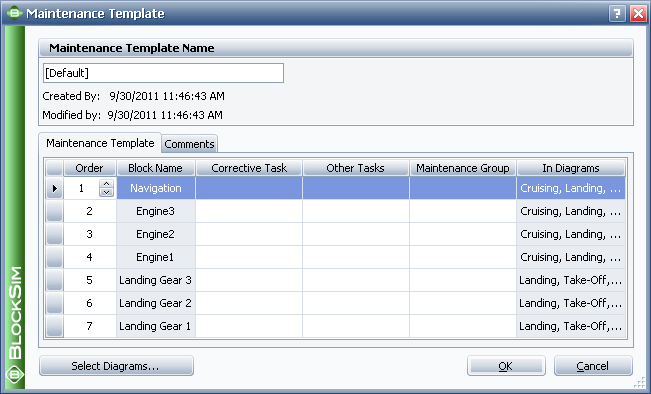 It is important to note that the settings specified here override those specified via the Block Properties window. Therefore, any tasks or maintenance groups that are assigned directly to a block via the Block Properties window will be ignored when the diagram is simulated as part of the simulation of a phase diagram. Only those tasks and maintenance groups specified in the maintenance template will be used under these circumstances.