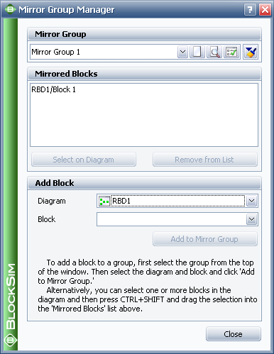 To add a block to the mirror group, you can select the diagram and block in the Add Block area and click the Add to Mirror Group button. You also can select the block(s) in the diagram, press CTRL+SHIFT and drag the block to the list in the Mirrored Blocks area of the Mirror Group Manager.