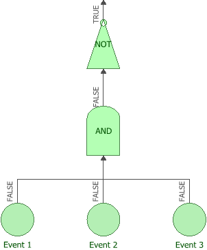 NAND gates are available only in analytical fault trees. There is no equivalent configuration in reliability block diagrams. The inputs to a NOT gate must be fixed probabilities, or evaluate to fixed probabilities; this is checked at analysis, and any input that evaluates to a time-varying model will result in an error.