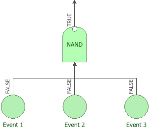 A NAND gate has a true output only if all input events are false; it has a false output event when any input event is true. In other words, if any of the input events occurs, then the output event will not occur. This is logically equivalent to using an AND gate followed by a NOT gate.