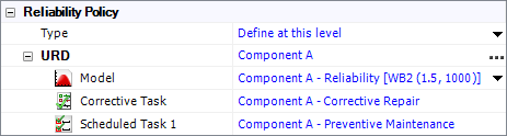 Define at this level allows you to assign a URD directly to the record. The reliability policy will either display the name of the URD or “Default (Not Set).” If the URD is not set, the software assumes the reliability is 100% (i.e., the item never fails, the cause never occurs, etc.).