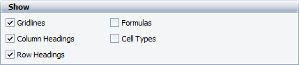 | Column and/or Row Headings | Hides the column and/or row headings. |
