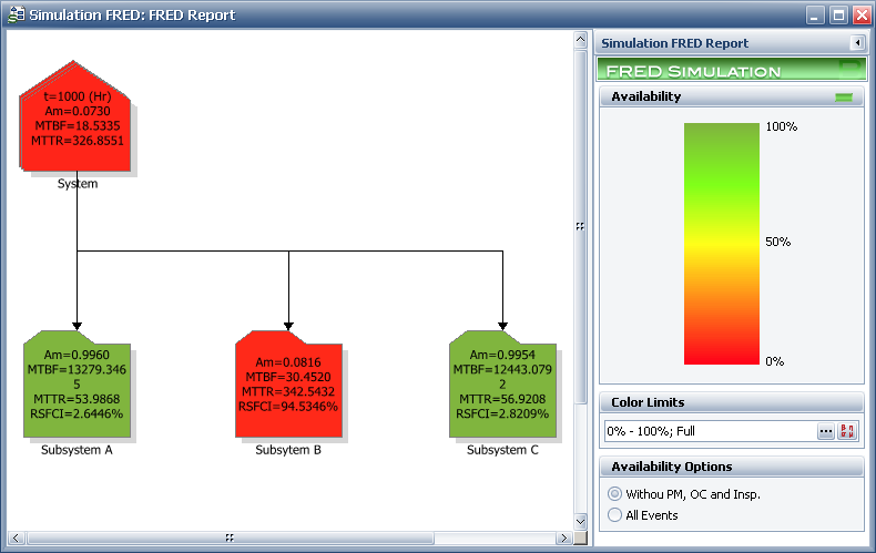 Simulation FRED reports illustrate the maintainability/availability characteristics of a system's components in a flexible, color-coded format. This report can be used to easily identify the components most in need of improvement in order to achieve the desired system maintainability/availability.
