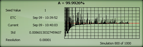 In addition, the current mean availability is shown at the top of the simulation status display. The current number of simulations performed out of the total number of simulations scheduled to be performed (or, in the case of a variable number of simulations, the maximum number of simulations) is shown at the bottom of the simulation status display (e.g., 10 out of 100 simulations).