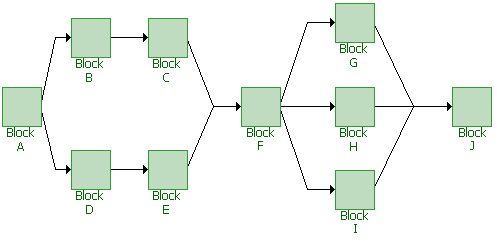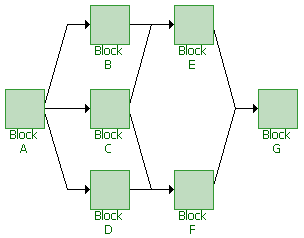 You can also use BlockSim to create "complex" block diagrams. Complex configurations cannot be expressed as a simple combination of series and/or parallel configurations and thus require a more advanced analytical treatment. A complex reliability block diagram is shown next.