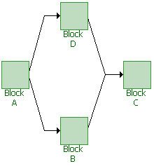 In a parallel configuration, items are considered to be redundant. In the RBD shown next, the system will continue to function if either Block D or Block B fails.